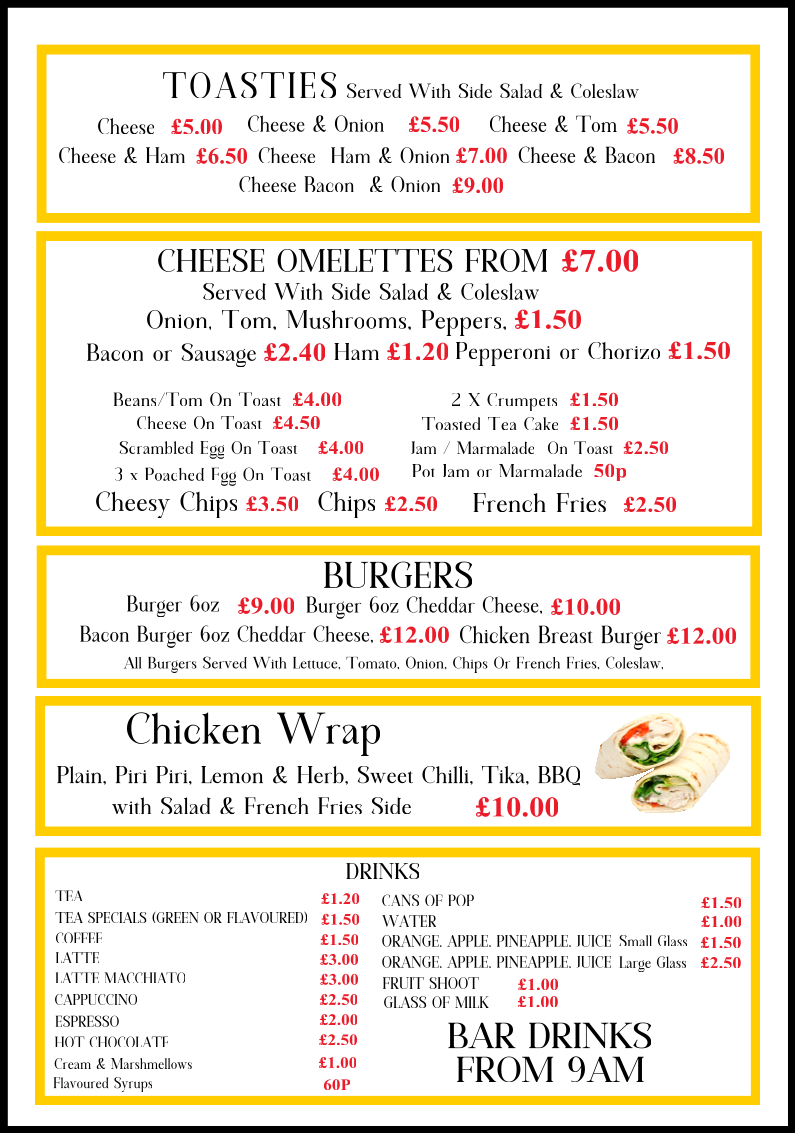 Drinks include a range of hot beverages such as tea, coffee, latte, cappuccino, espresso, and hot chocolate. Cold drink options feature cans of pop, fruit shoots, energy drinks, water, and fresh squeezed orange juice.
