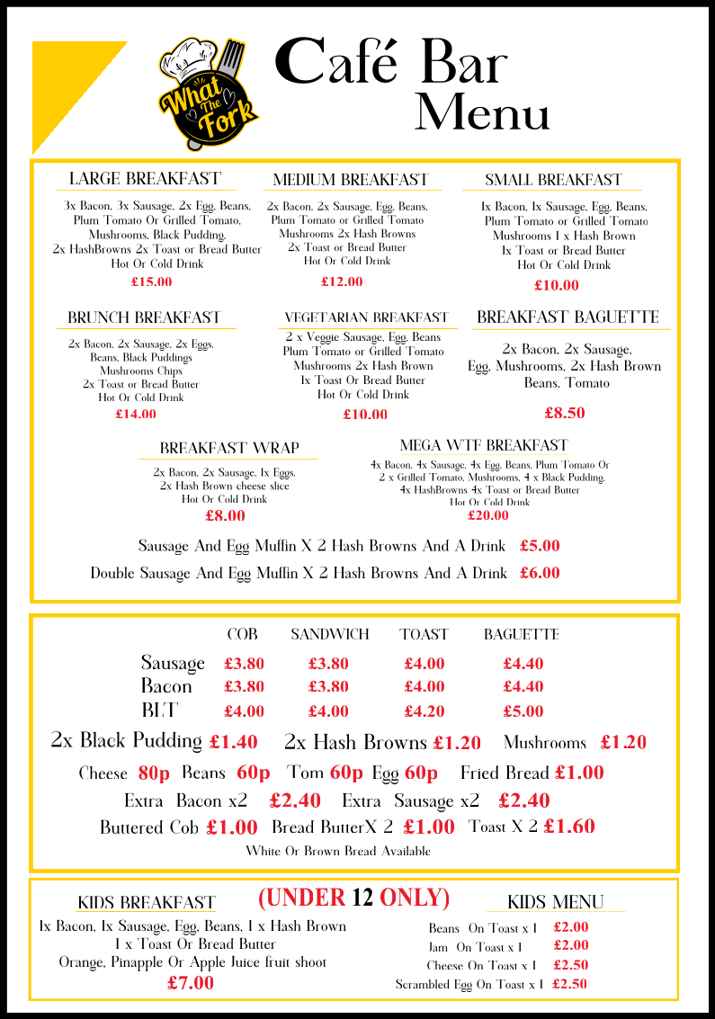 The menu at What the Fork Cafe & Bar offers a variety of options suitable for breakfast, light meals, and casual dining. It is organized into several key sections to help visitors navigate their choices easily.